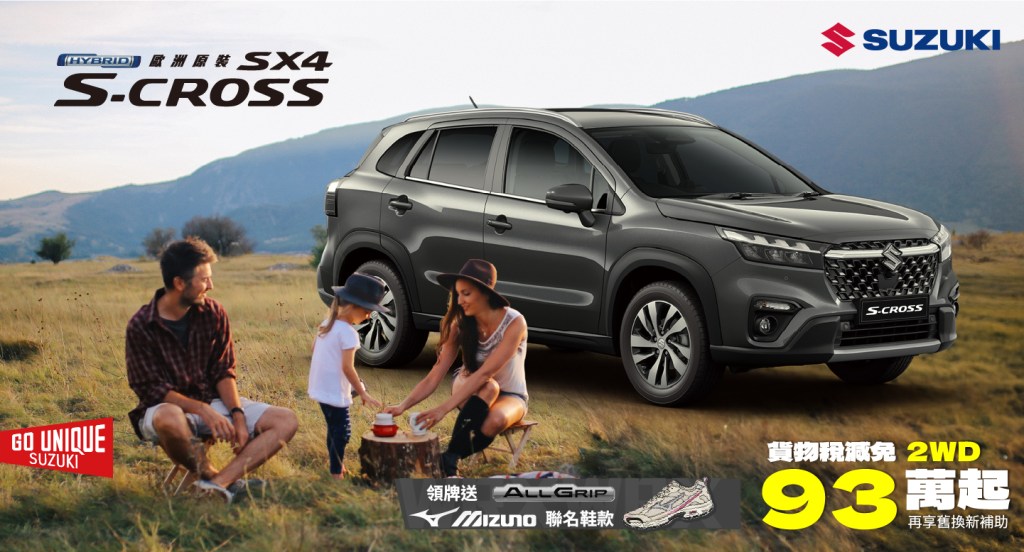 3. *「SUZUKI ALLGRIPxMIZUNO 跨界聯名專案」:本活動之適用對象為於2026/03/01~2026/03/31期間內購買S-CROSS 4WD、VITARA 4WD且完成領牌者,可獲得MXR乙雙(下稱贈品),原價新台幣3680元。數量及鞋子尺寸有限,送完為止。贈品以實物為準,恕不接受更換、退費或折抵現金。兌換憑證逾期、遺失或毀損,恕不補發。任何贈品使用之相關疑問,請逕洽台灣美津濃股份有限公司客服專線:02 2509-5100詢問, TAIWAN SUZUKI或原購車經銷商不負任何贈品擔保責任。 本活動不適用租賃、政府機關、專案批/標購者及營業車。兌換時間:2026年01月25日~2026年05月31日止。