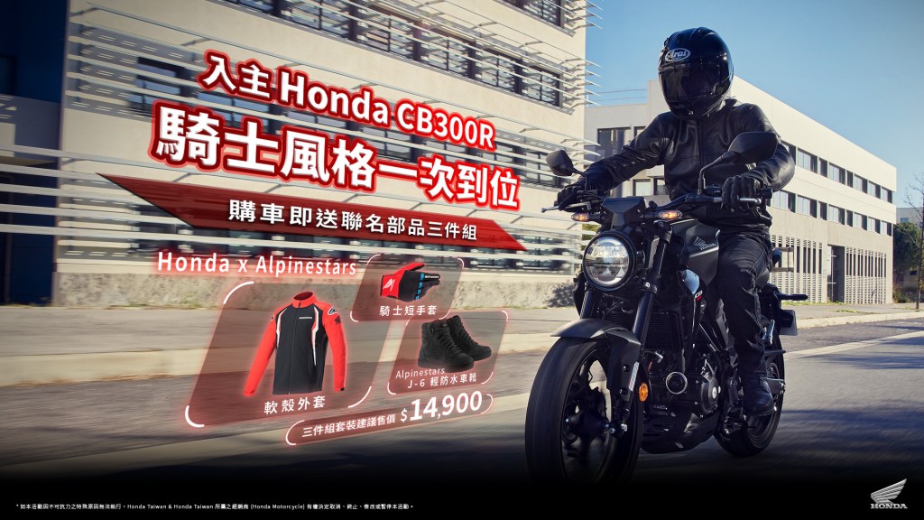 訂購CB300R即送Alpinestars聯名三件騎乘裝備組