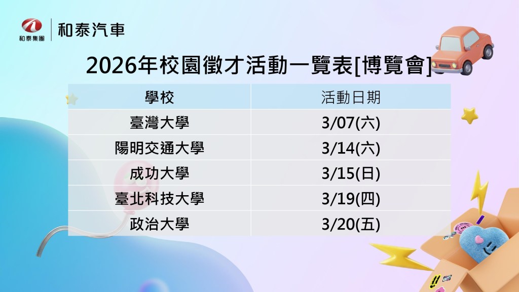 和泰汽車今年首場大型校園徵才活動將於3月7日臺灣大學校園徵才博覽會登場,後續亦將前往陽明交大、成功大學、台科大、政大、清大、北科大、中正、師大、東海等校園與同學面對面交流。現場除提供職缺諮詢與履歷健檢外,也安排主管與學長姐分享職涯經驗,協助同學深入了解企業文化與未來發展方向。