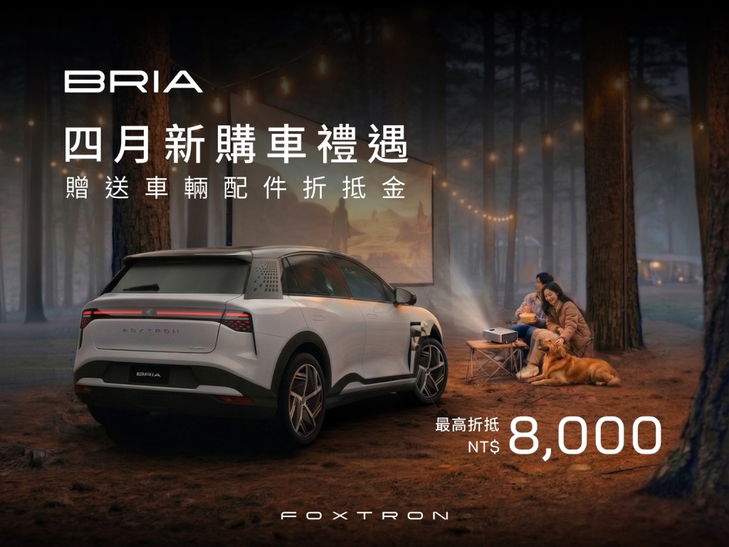 為讓廣大消費者能輕鬆體驗純電生活,FOXTRON於四月特別推出專屬購車禮遇。自2026年4月1日起至4月30日止,凡完成下訂BRIA Emerge或Pioneer車規,並於當月完成領牌之新車主,即可獲得最高8,000元的車輛配件折抵金(註1),讓準車主們於購車當下即能自由選配實用配件,打造專屬座駕,完善個人化的移動需求。