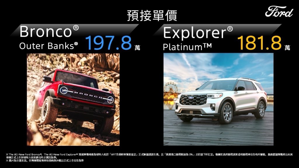 - 〔註二〕The All-New Ford Bronco®、The All-New Ford Explorer® 預接單價格係為福特六和於「ART台美對等貿易協定」正式審議通過生效,且「美國進口關稅假設為 0%」之前提下所訂定。後續若政府關稅政策或相關稅率公告有所變動,最終建議售價將以未來車輛正式上市時福特六和官網公布之資訊為準。