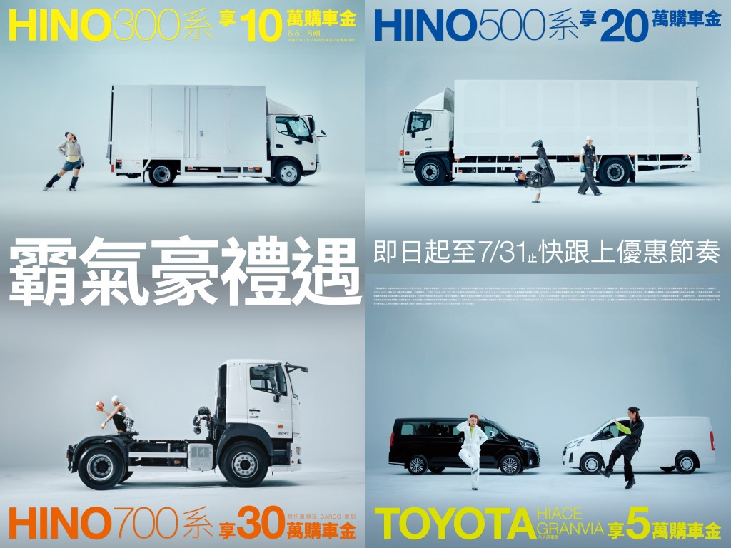 「霸氣豪禮遇」優惠活動自即日起至7/31止,有購車需求的顧客,敬請把握購車時機,跟上優惠節奏! 誠摯邀請您蒞臨HINO及TOYOTA商旅車所屬經銷商-長源汽車、蘭揚汽車及東部汽車營業據點洽詢。若有購車相關問題亦可至HINO官網(www.hino.com.tw)及TOYOTA商旅車官網(https://www.toyotacv.com.tw/)查詢,或致電顧客服務中心0800-522-567洽詢。HINO及TOYOTA商旅車保留以上活動內容變更及最終解釋之權利,變更或修改訊息將於HINO及TOYOTA商旅車官網公告,恕不另行通知。
