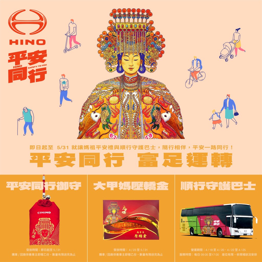 即日起至5月31日止,凡購買HINO商用車或TOYOTA GRANVIA、HIACE及 COASTER,回HINO原廠保養維修之車主,即可獲贈由HINO精心設計、經大甲鎮瀾宮過爐的「平安同行御守」乙個。另自4月23日起至5月31日止,符合前述條件者,加碼贈送「大甲媽壓轎金」乙份。